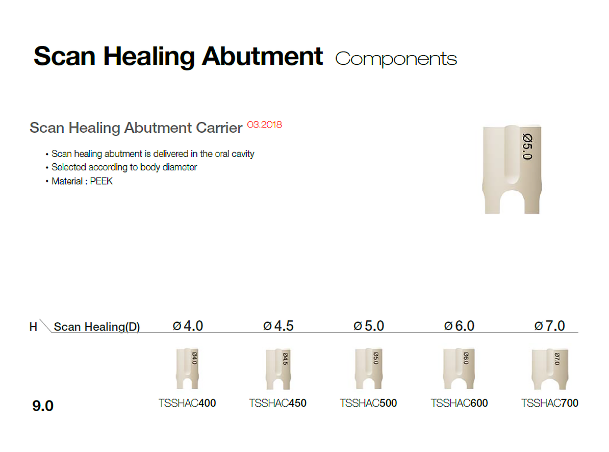 TS Scan Healing Abutment - Spl Offer (2+1) Osstem Log in for pricing Scan Healing Abutment Healing abutment with scan body function Specifications are identified by the indents on the abutment head Abutment level impression Has a dedicated driver integrated carrier...